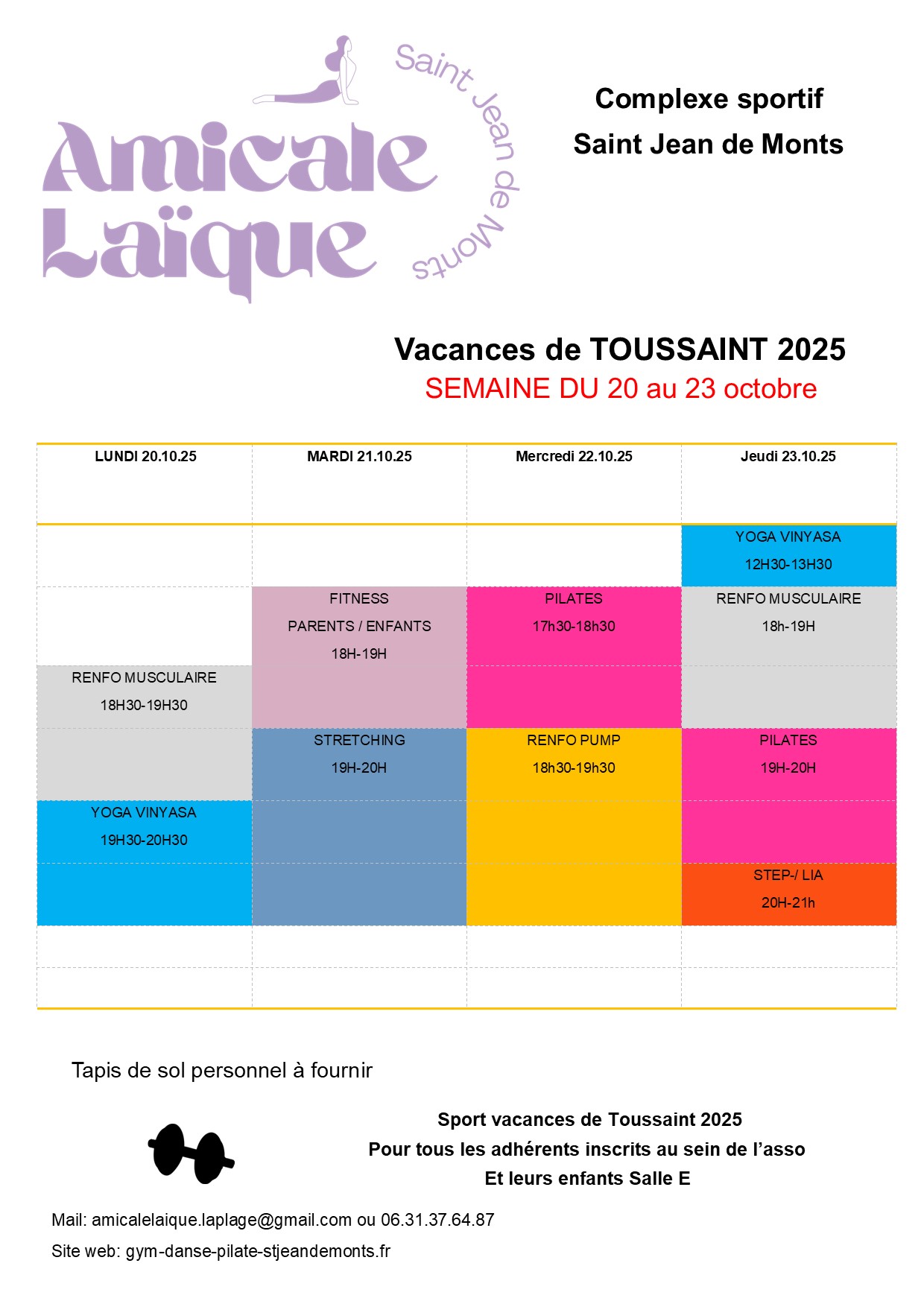Sport vacances de Toussaint Sport pendant les vacances de Toussaint Complexe sportif salle E Du lundi 20 au jeudi 23 octobre 2025 Ouvert à tous nos adhérents et le mardi sport avec enfants ……